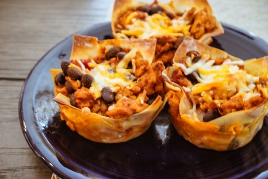 - Place 1 teaspoon of the salsa con queso in each of the wonton wrappers, then add a layer of chicken bean mixture (use only half of the mixture). Sprinkle about half of the cheese on each of the tacos. Add 1 more wonton wrapper to each, followed by the remaining taco mixture and then the remainder of cheese